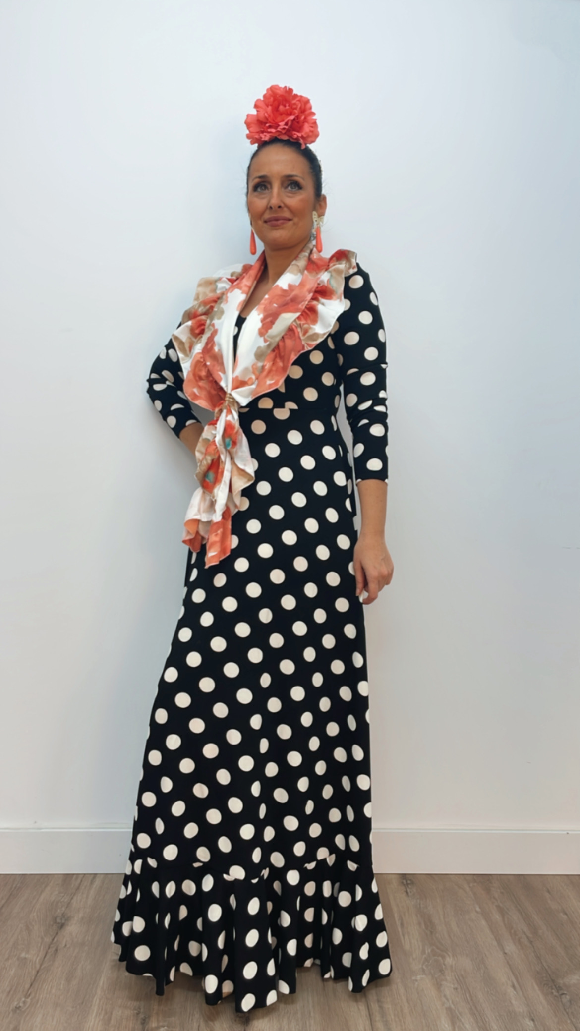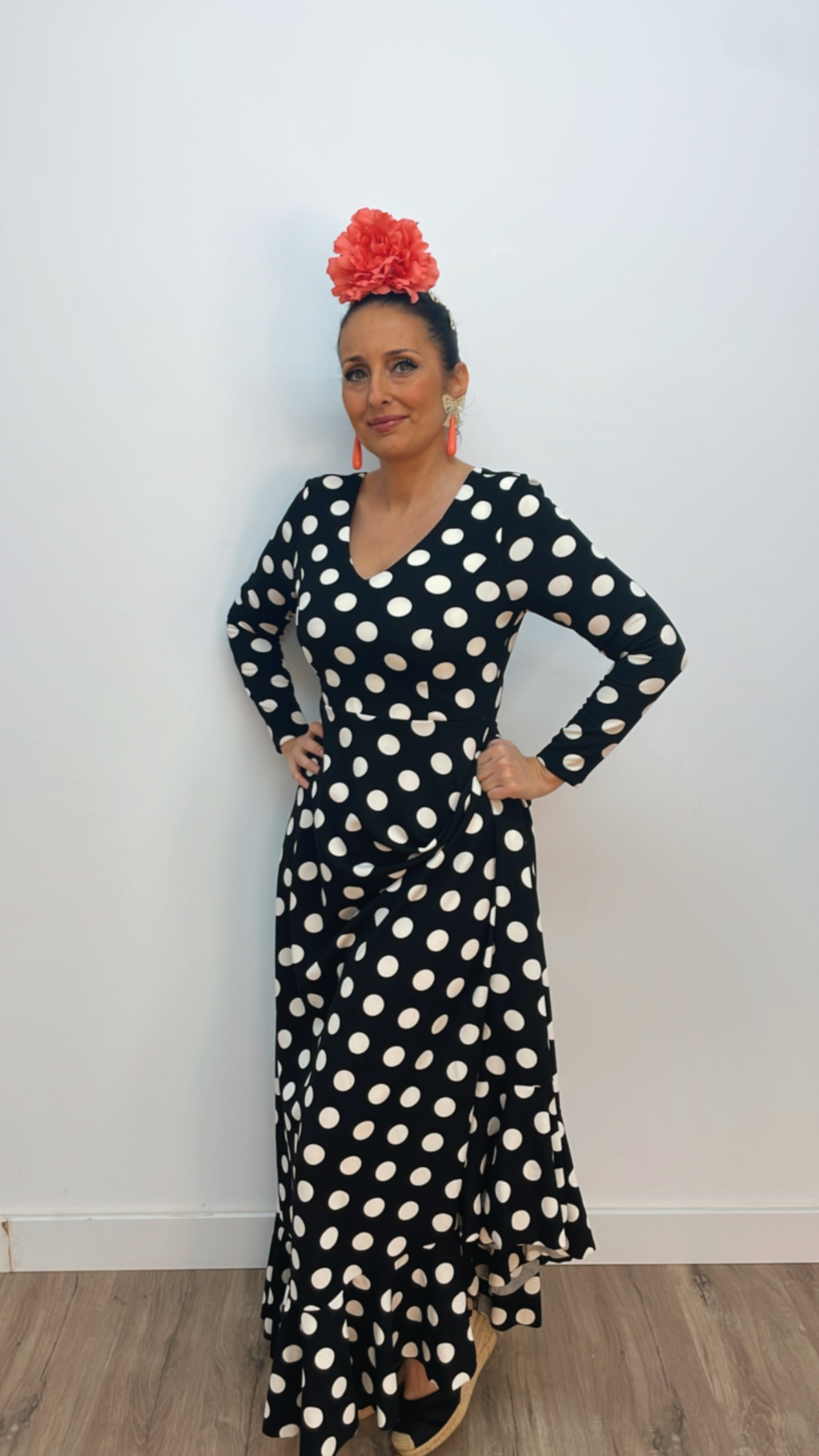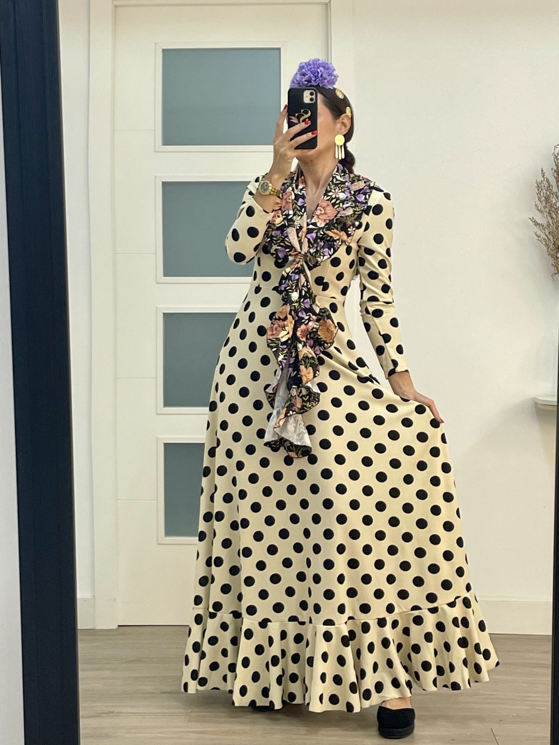 - Tejido de crepé elástico ,con un solo volante, manga larga, cremallera invisible, escote de pico por delante y por detrás.