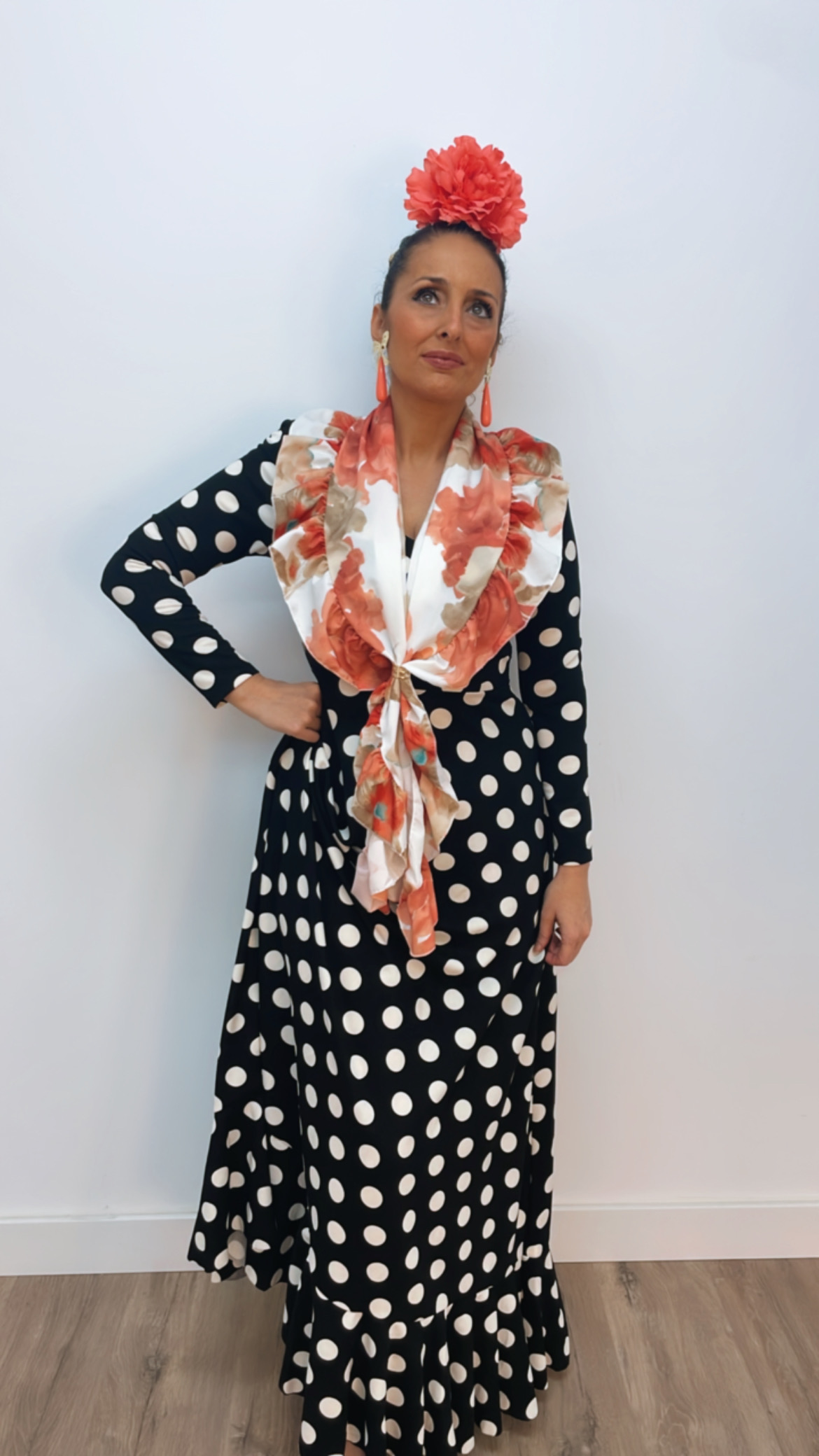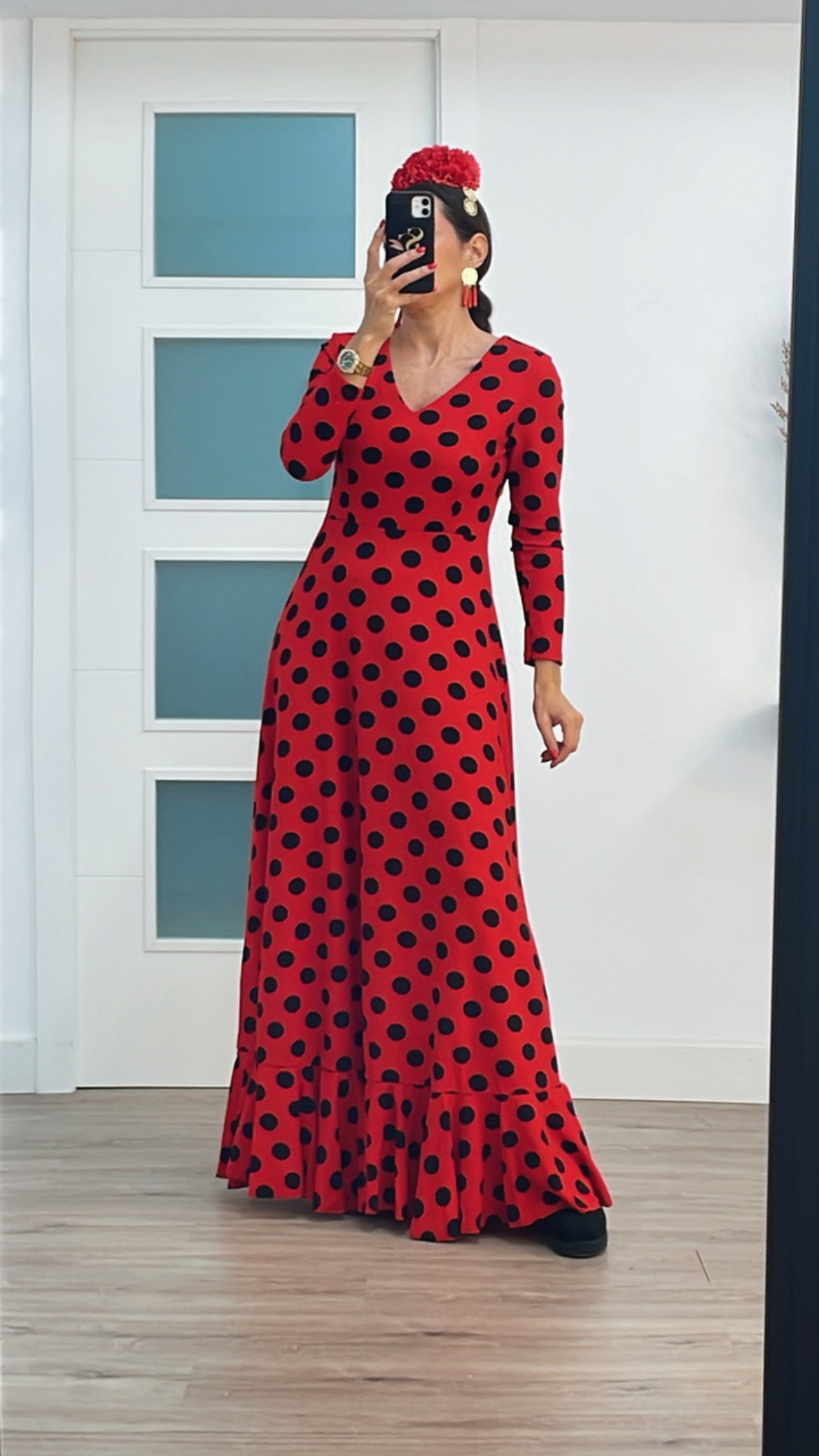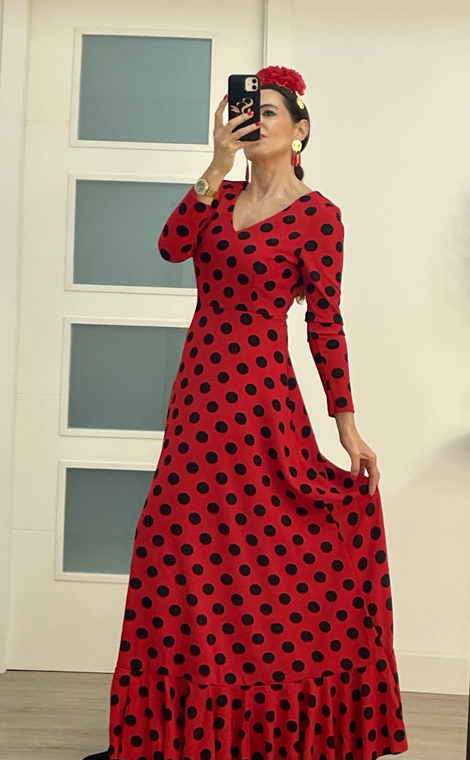 - Tejido de crepé elástico ,con un solo volante, manga larga, cremallera invisible, escote de pico por delante y por detrás.