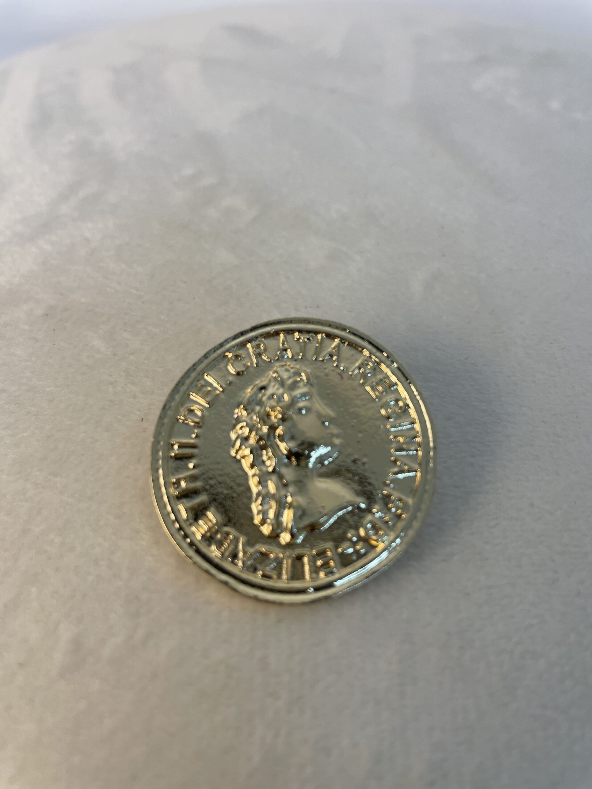 - Broche en color dorado con una cara en relieve ,simulando a una moneda.