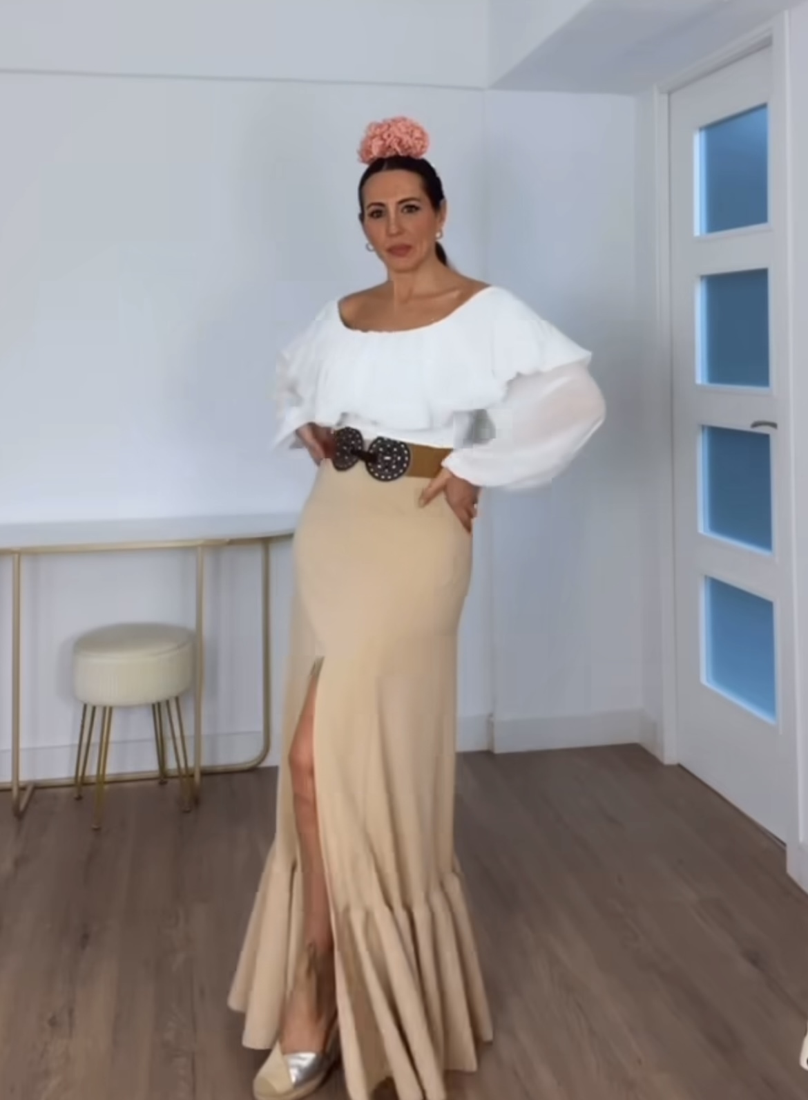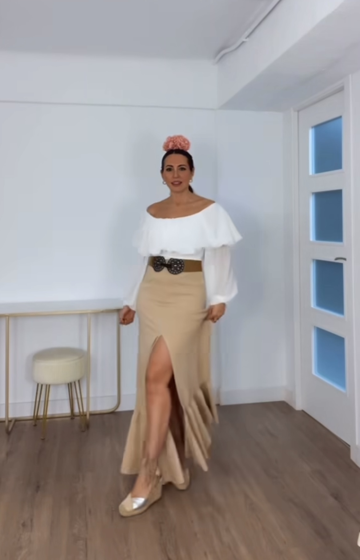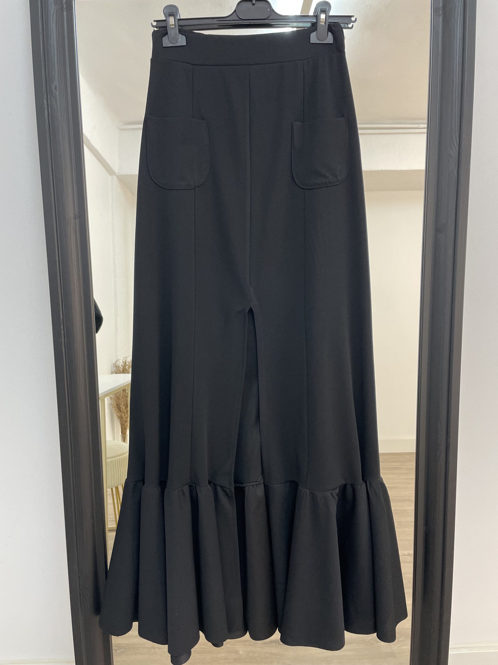 - Falda en tejido de crespón elástico ,con abertura frontal y dos bolsillo de parche, terminación con un volante.