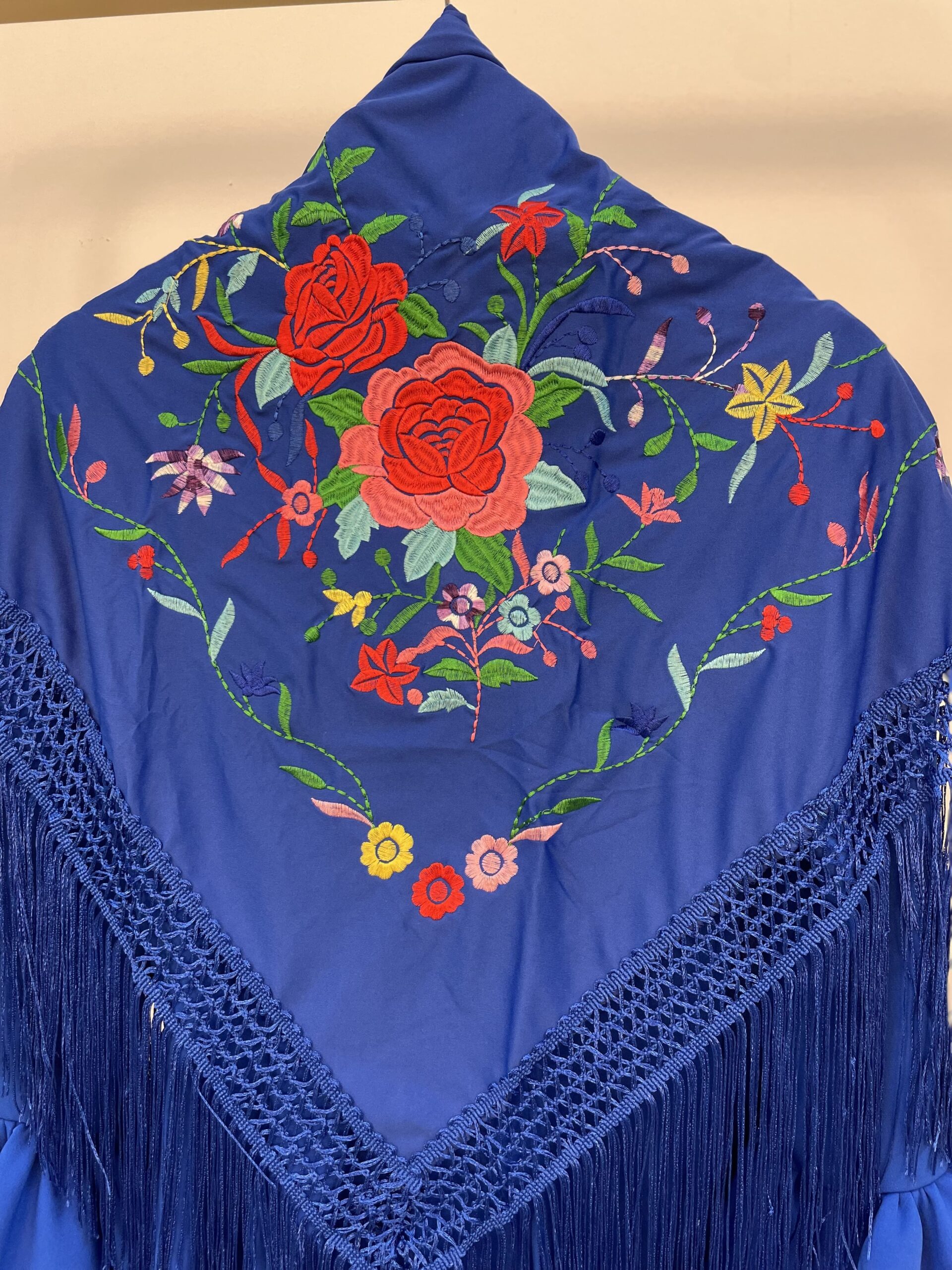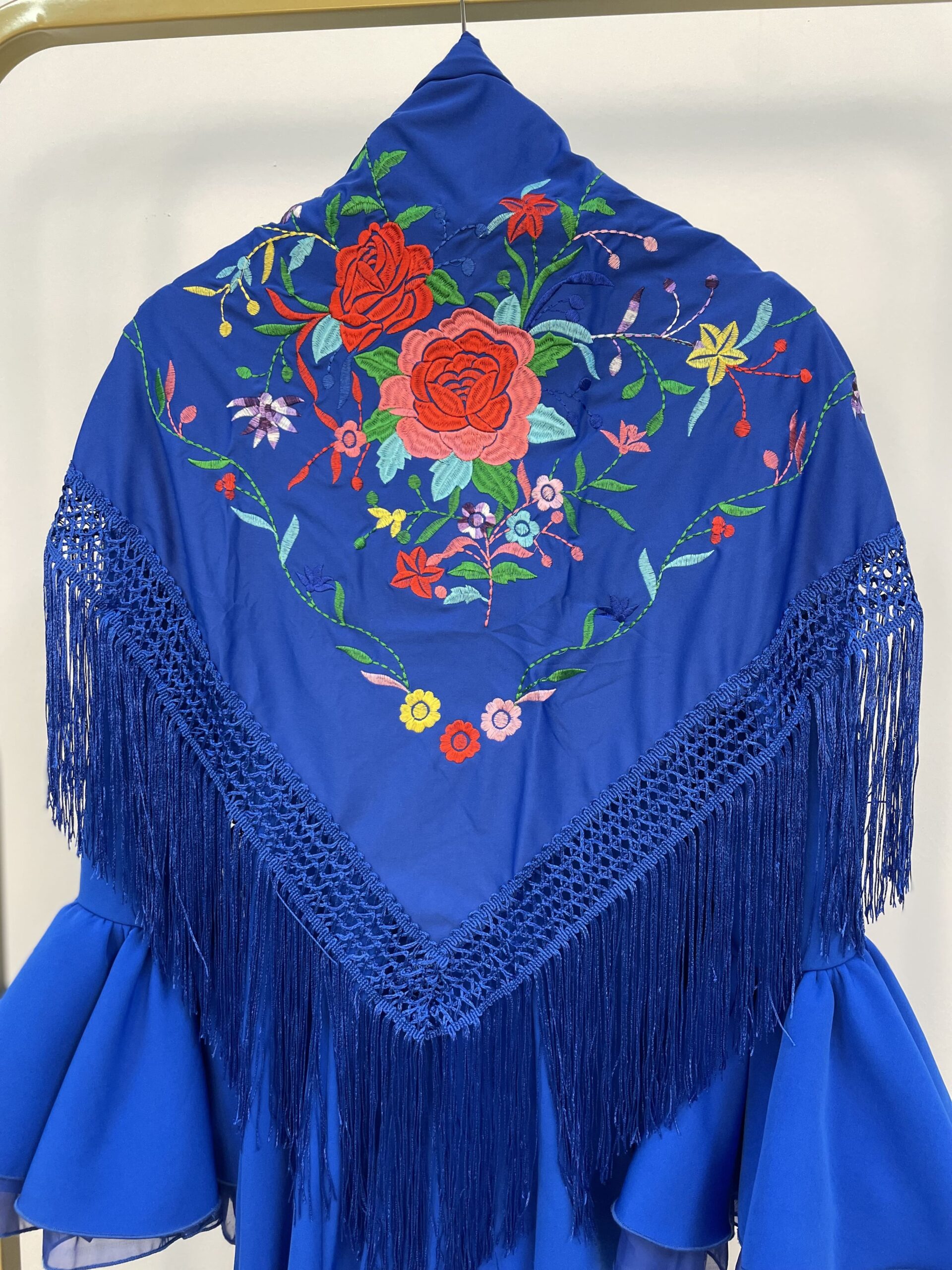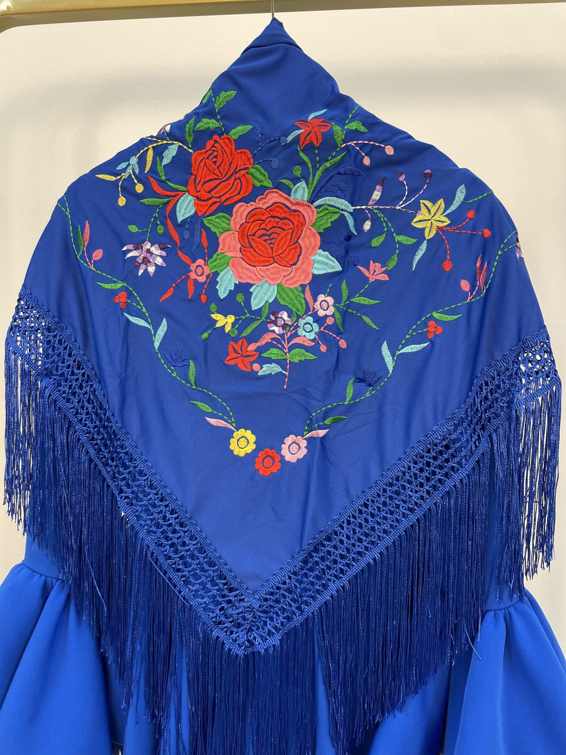 1. Mantón azul eléctrico con bordado de colores.