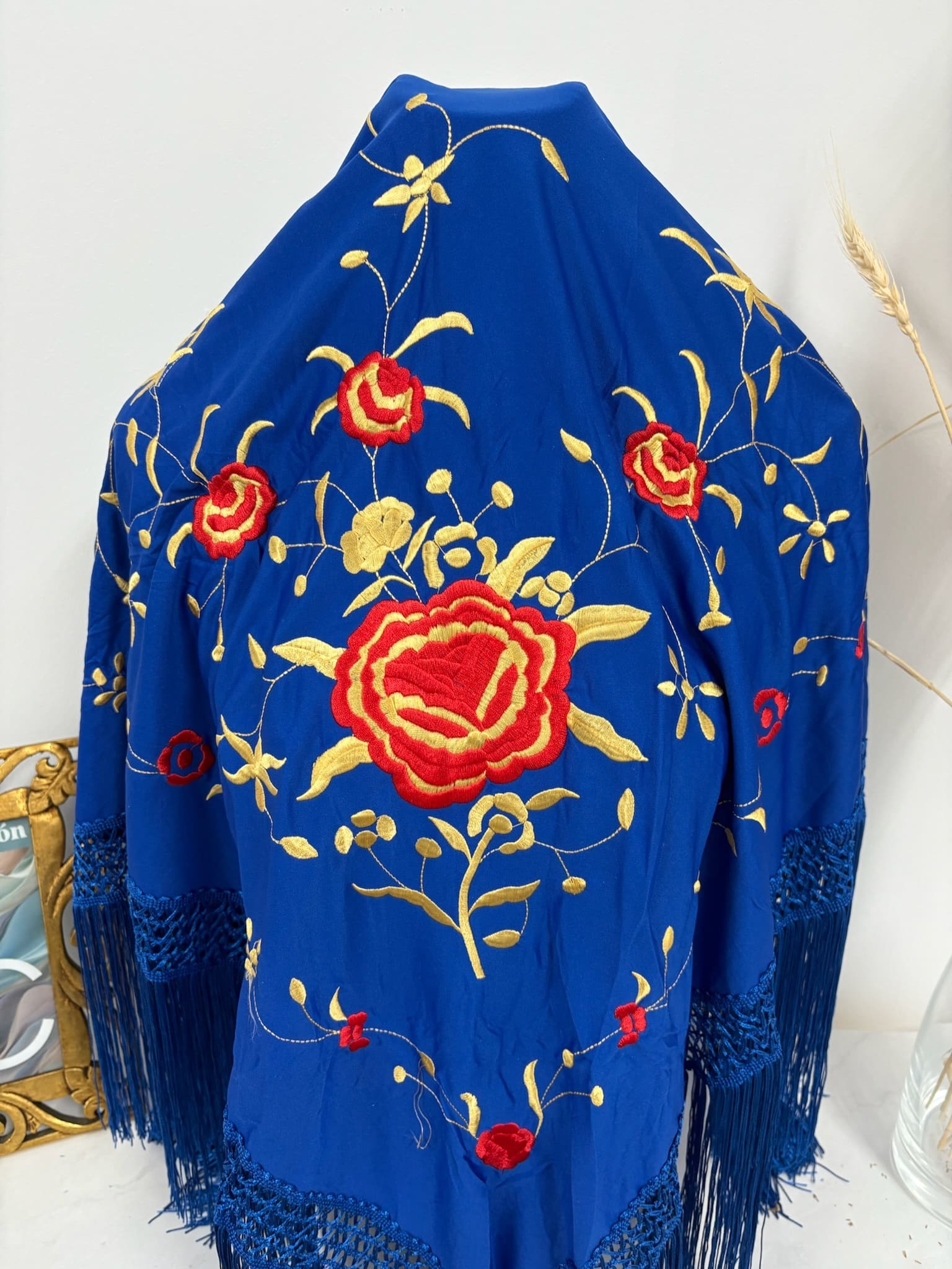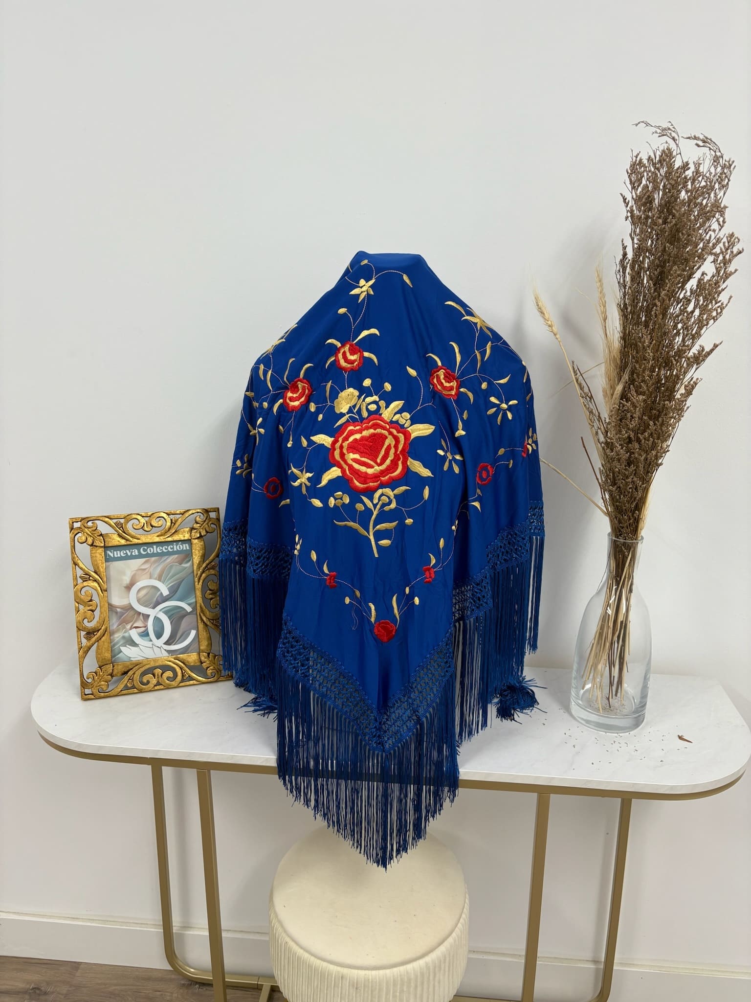 - Mantón en color Azulina con bordado de 1 rosa en rojo y dorado.