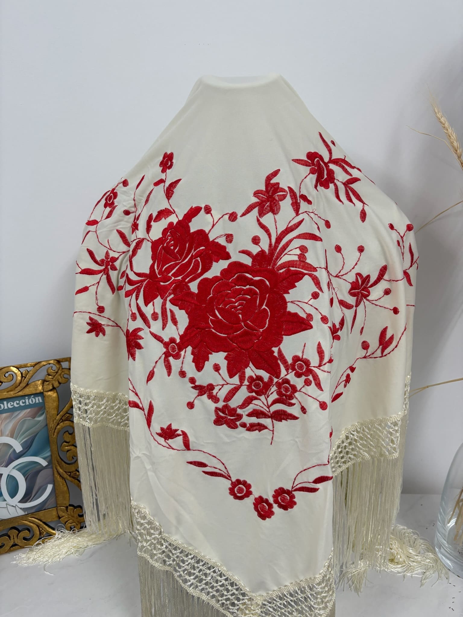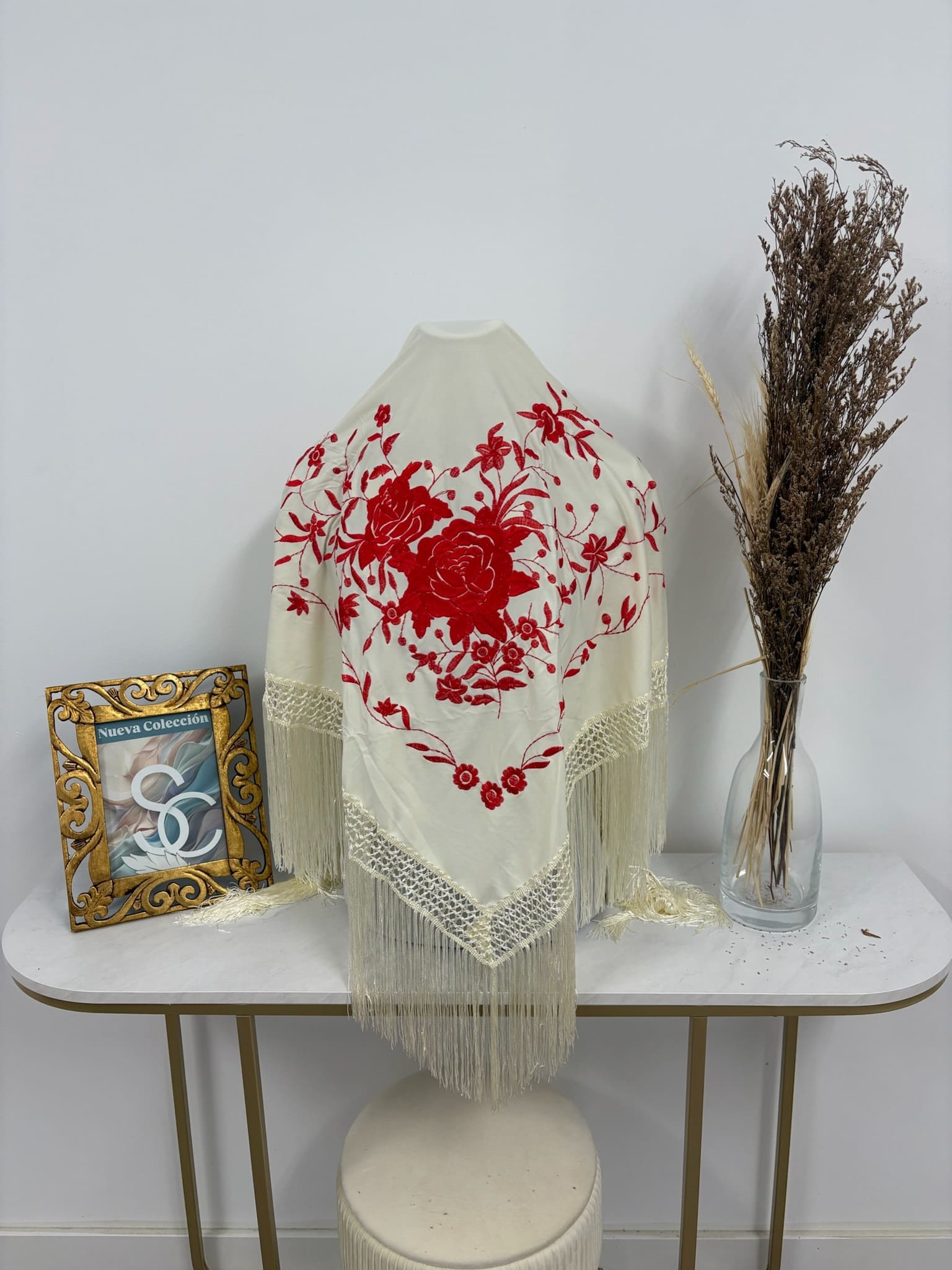 - Mantón en color Beige con bordado de 2 rosas en rojo.