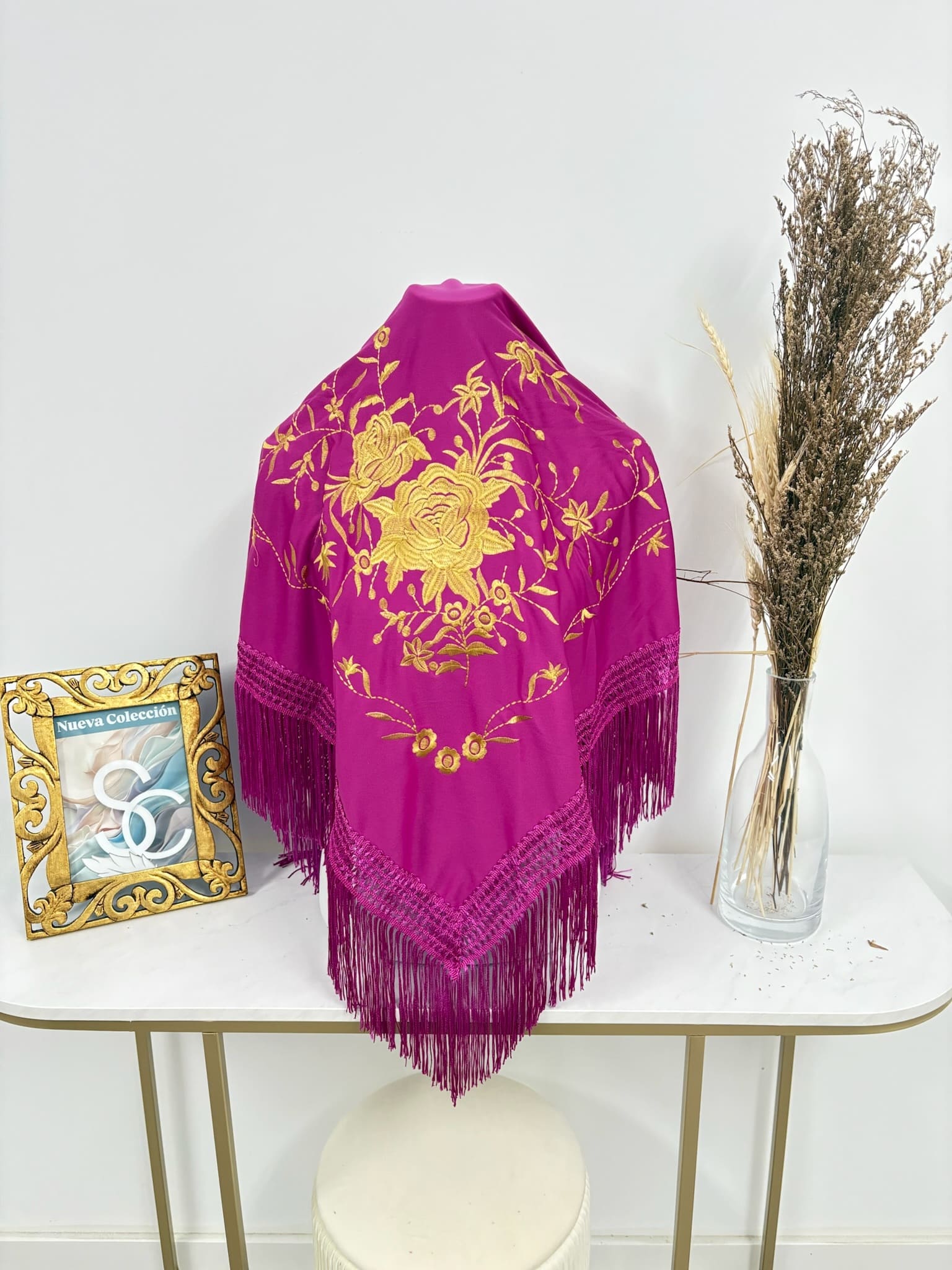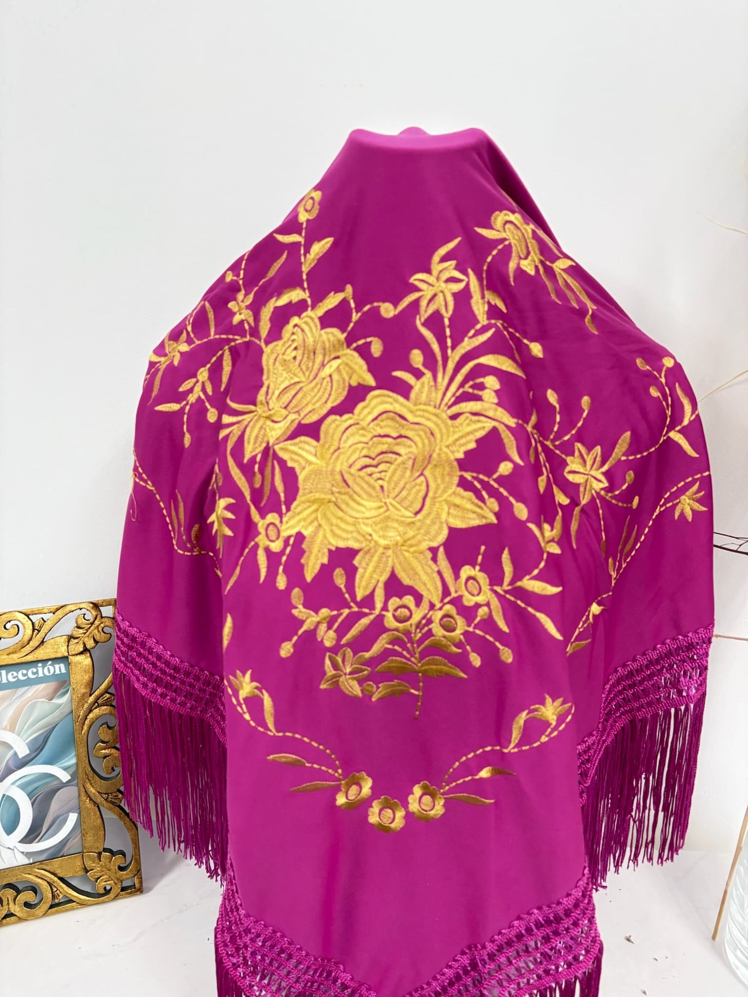 - Mantón en color Buganvilla con bordado de flores en dorado.