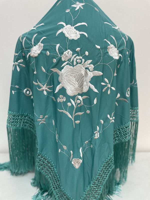 - Mantón en color agua marina con rosas estampadas en color plata.