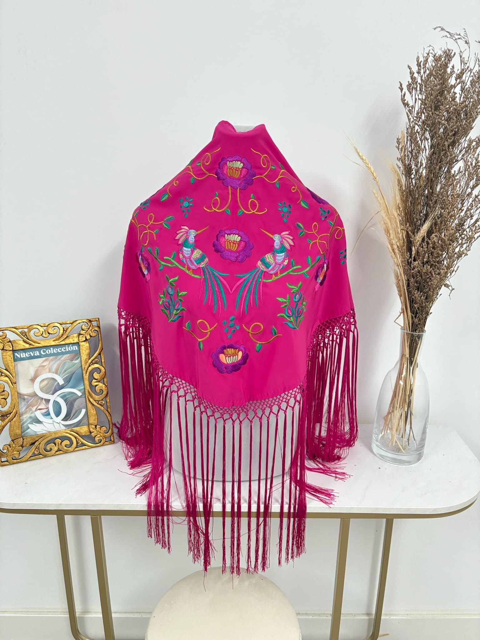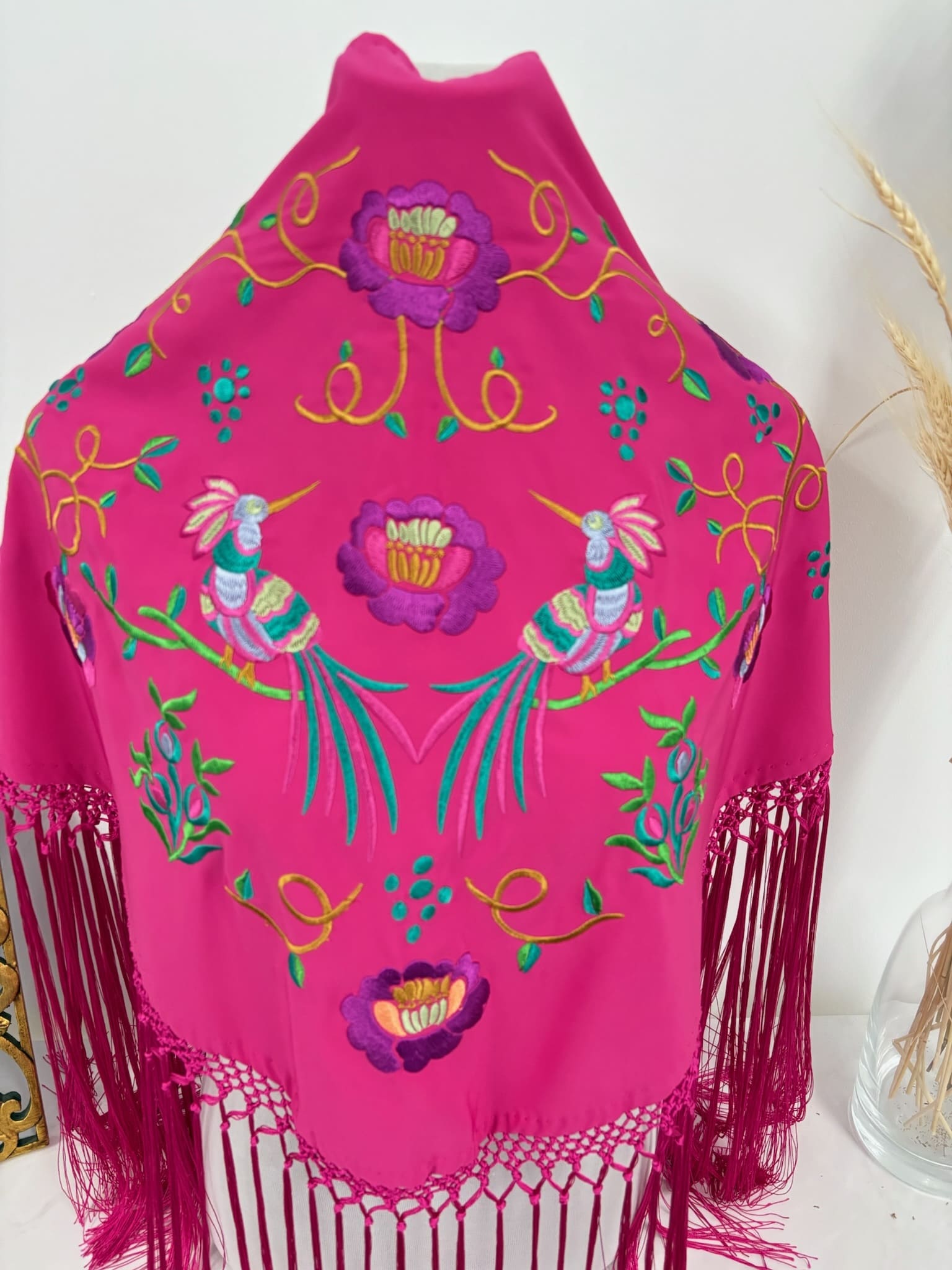 - Bordado colorido con dos pájaros centrales y enmarcados en flores.