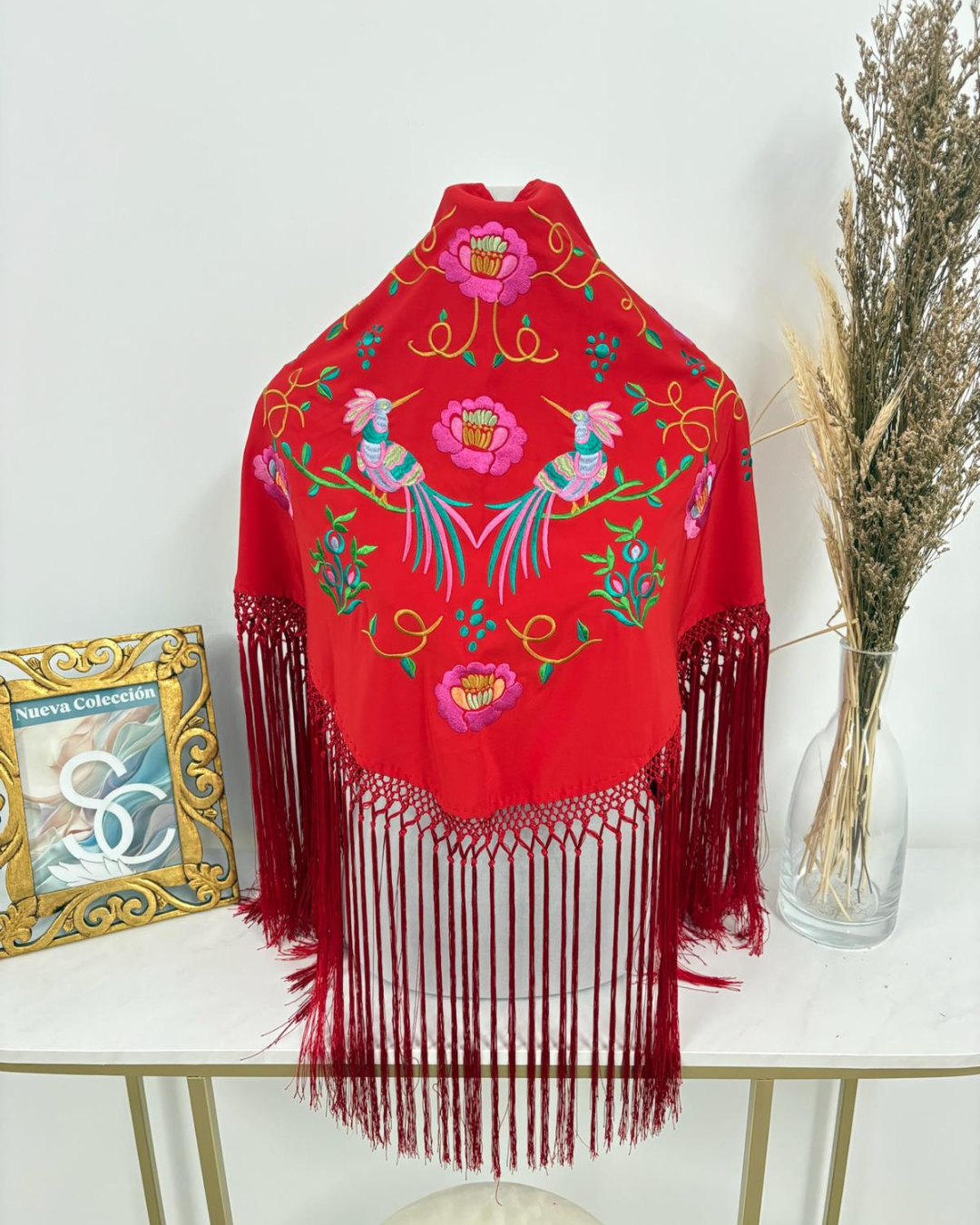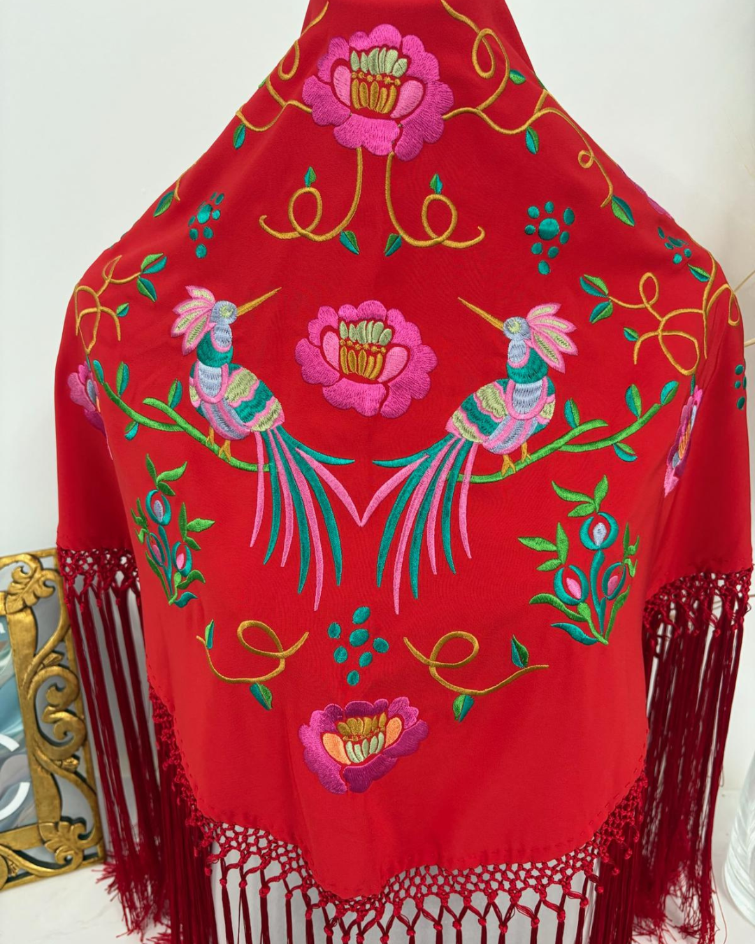 - Bordado colorido con dos pájaros centrales y enmarcados en flores.