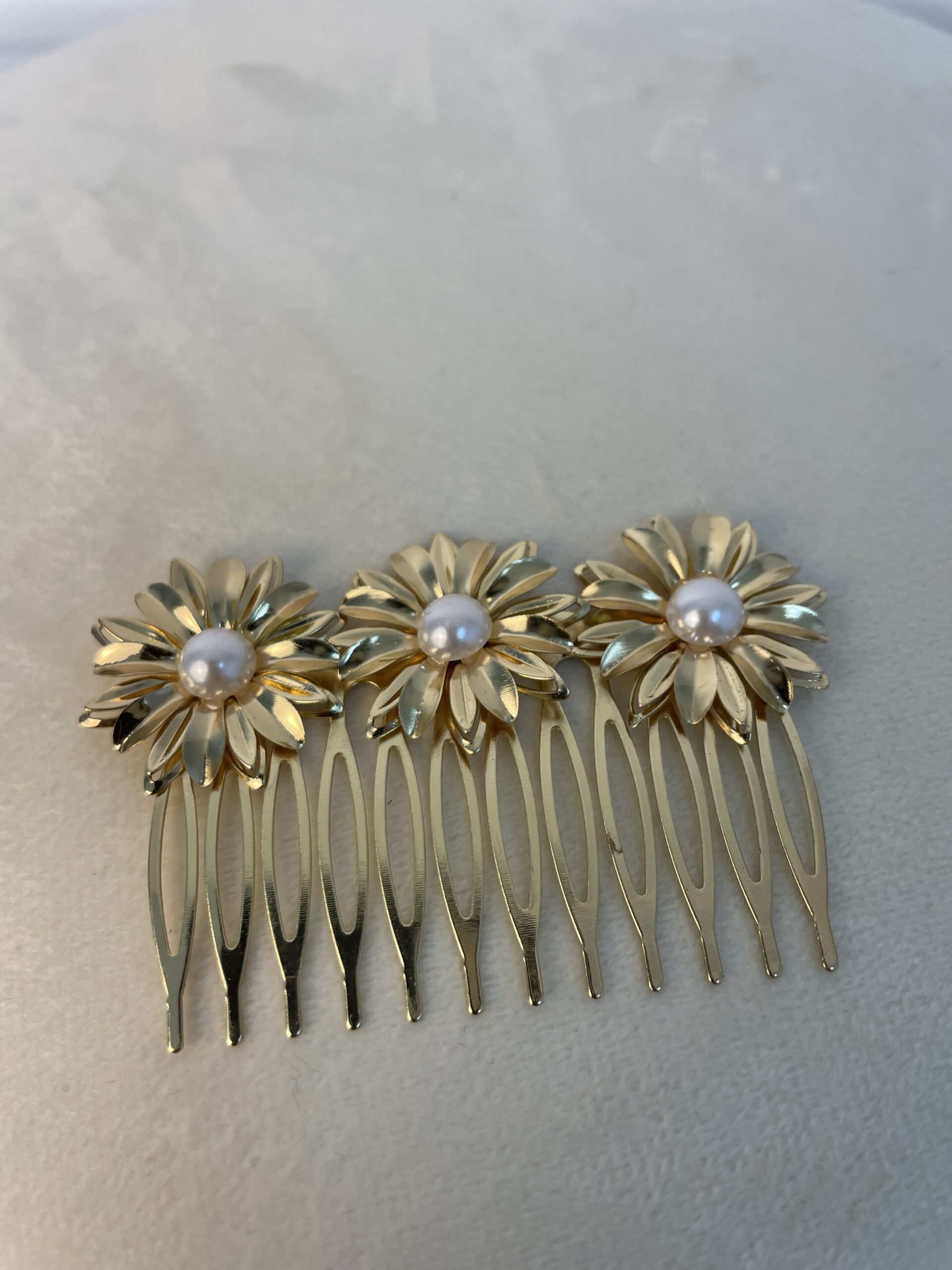- Peinecillo en color Dorado simulando a tres flores con Perlas Doradas, como margaritas con 12 púas.