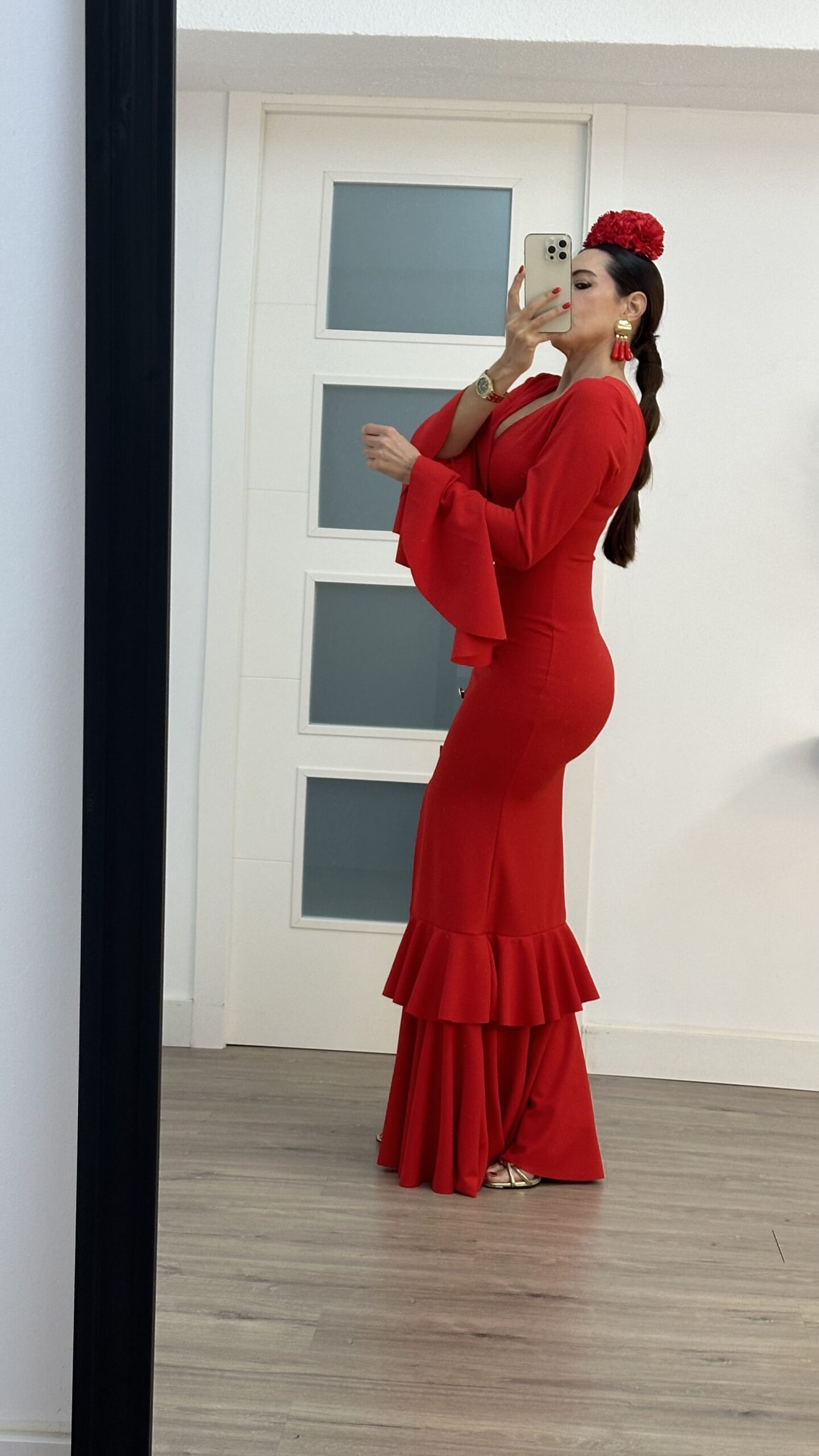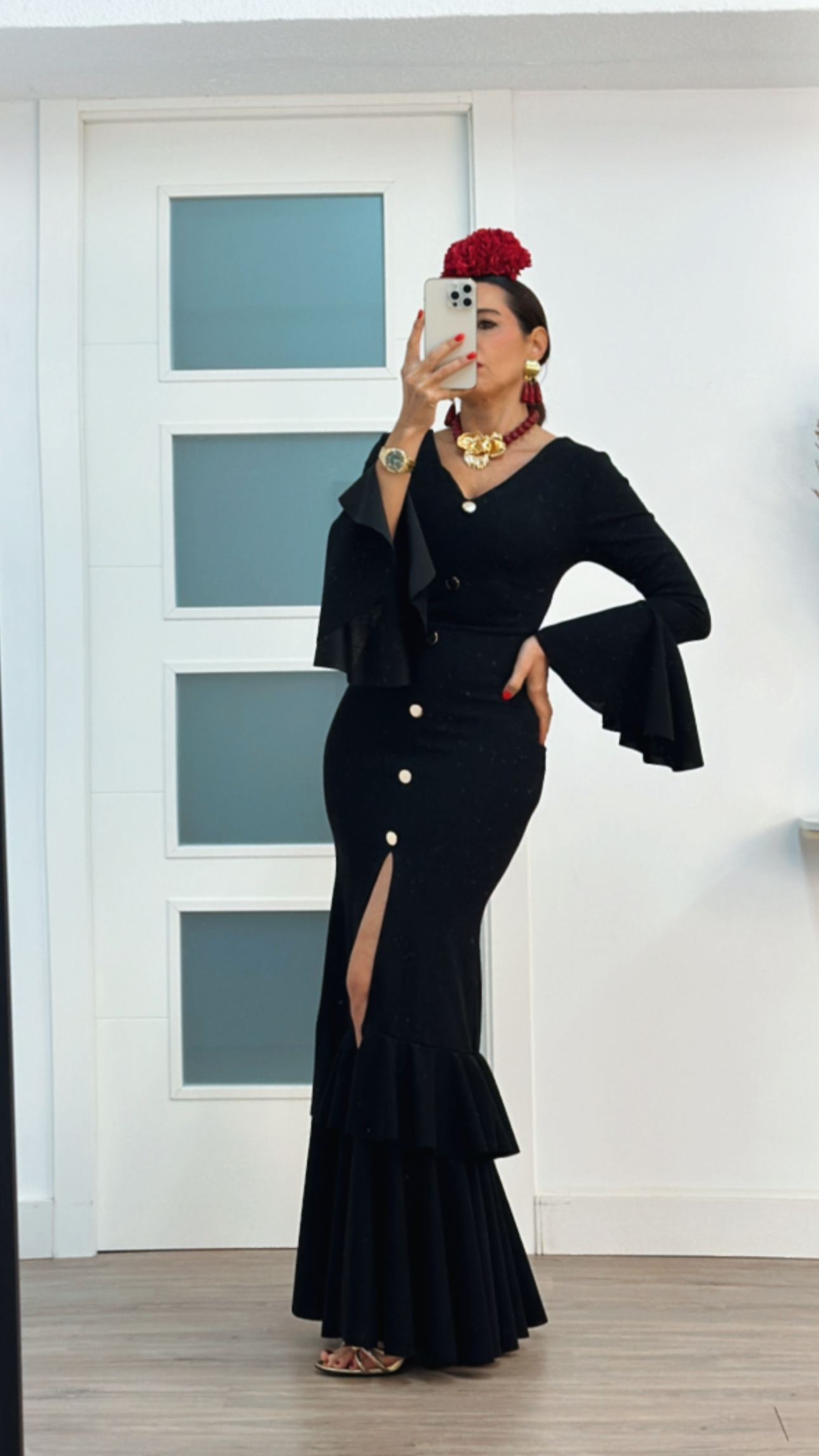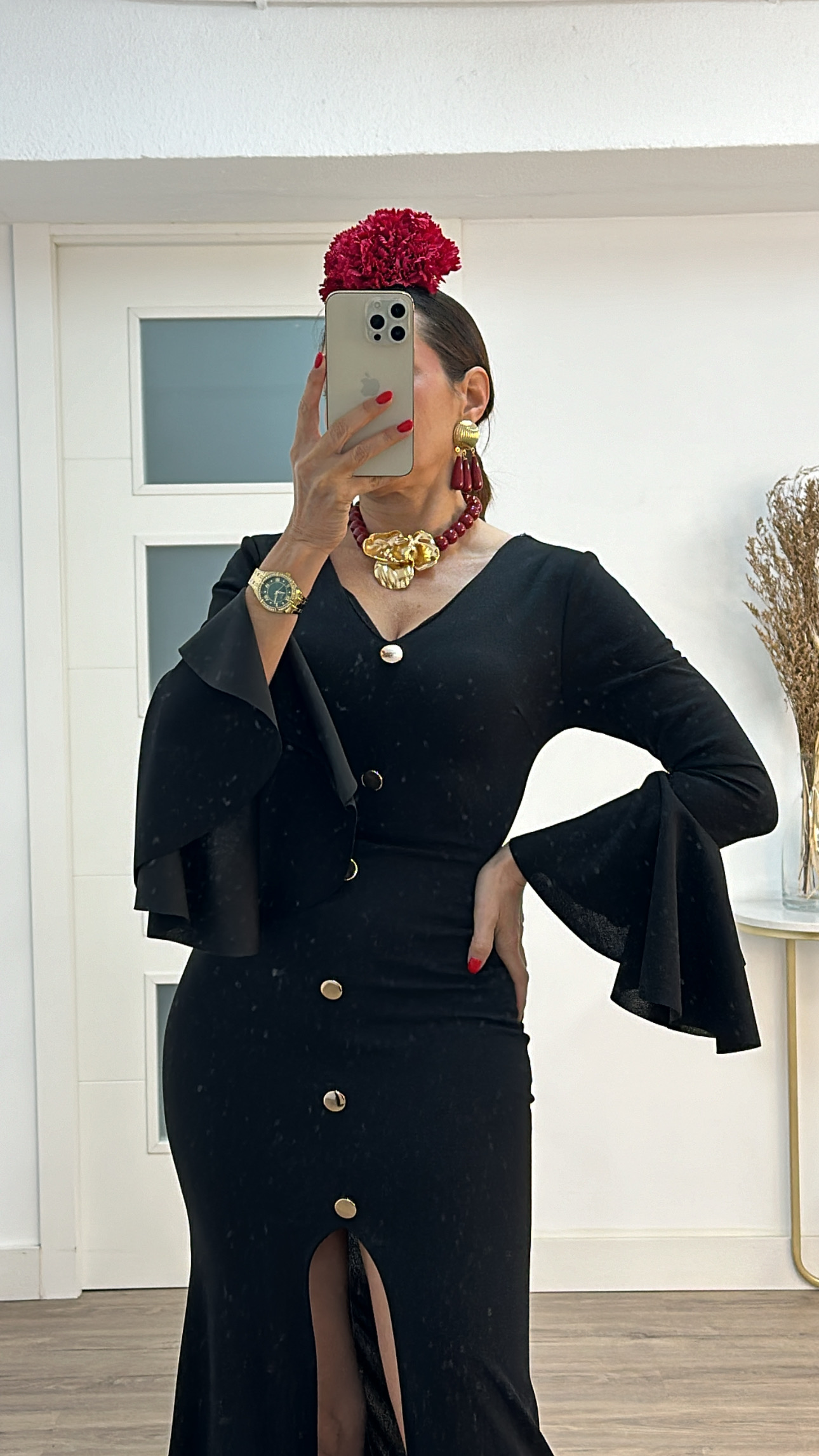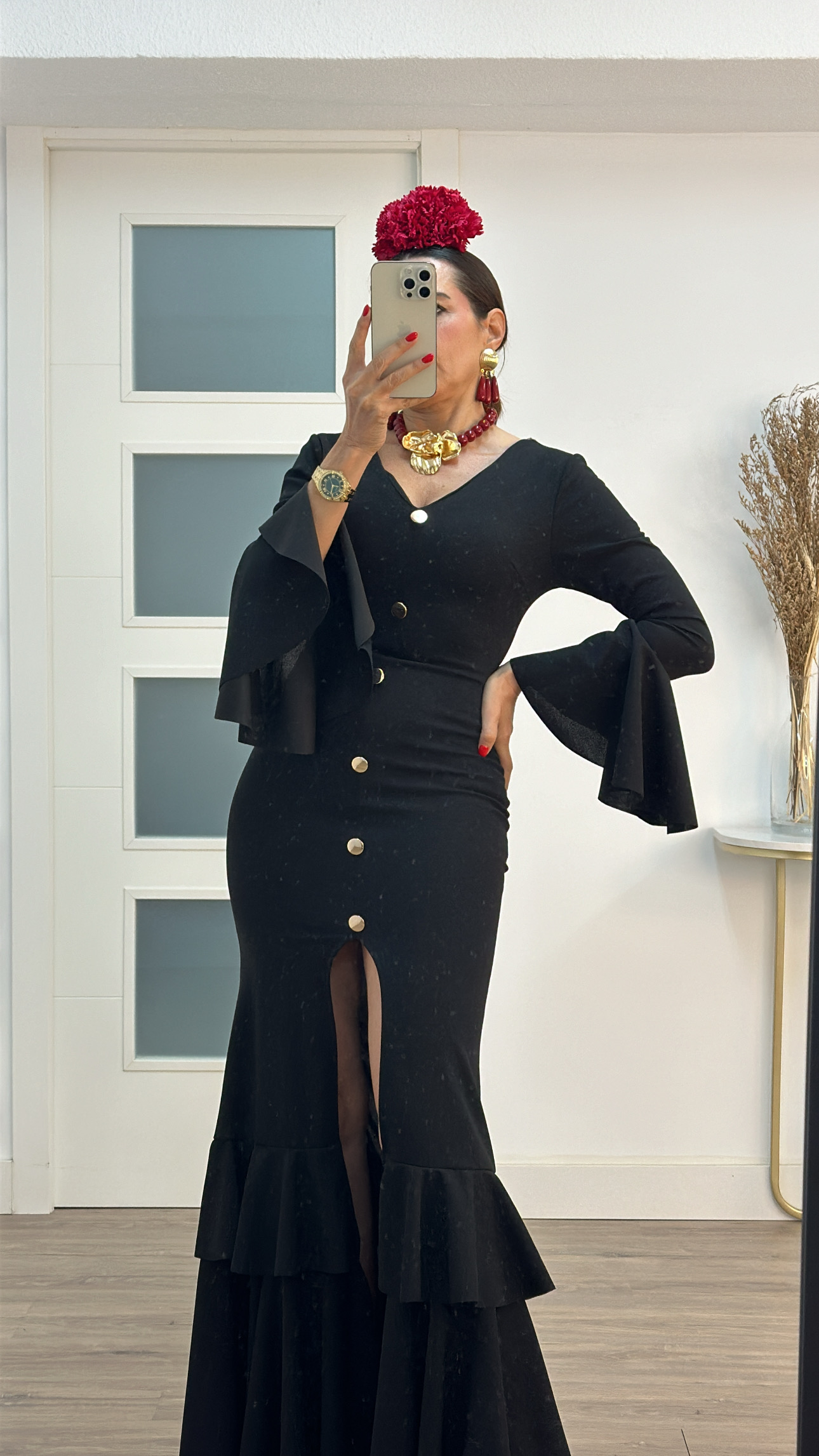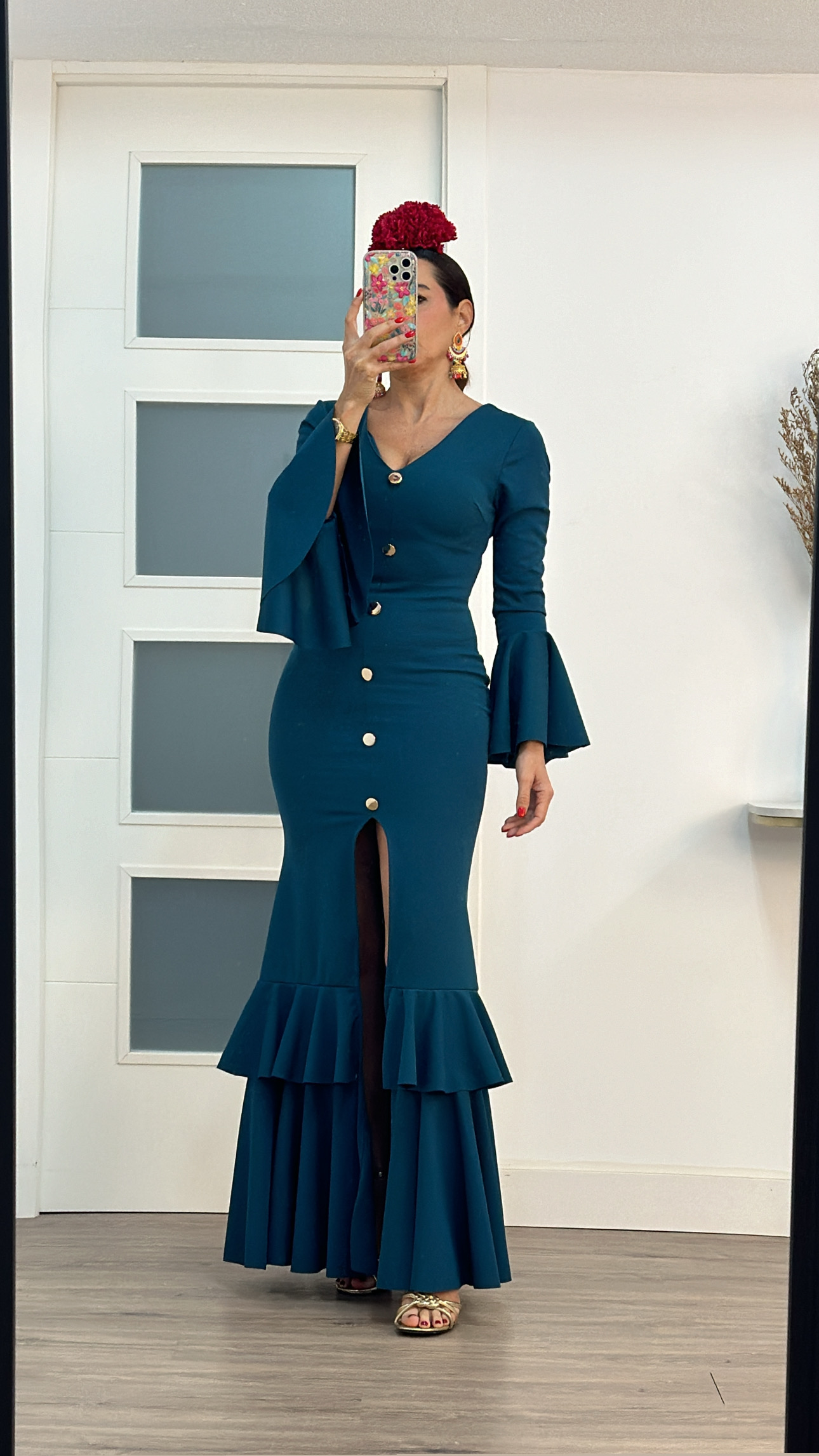 - Abotonadura central en color dorado, con abertura ,dos volantes, escote en uve por delante y por detrás cremallera invisible.